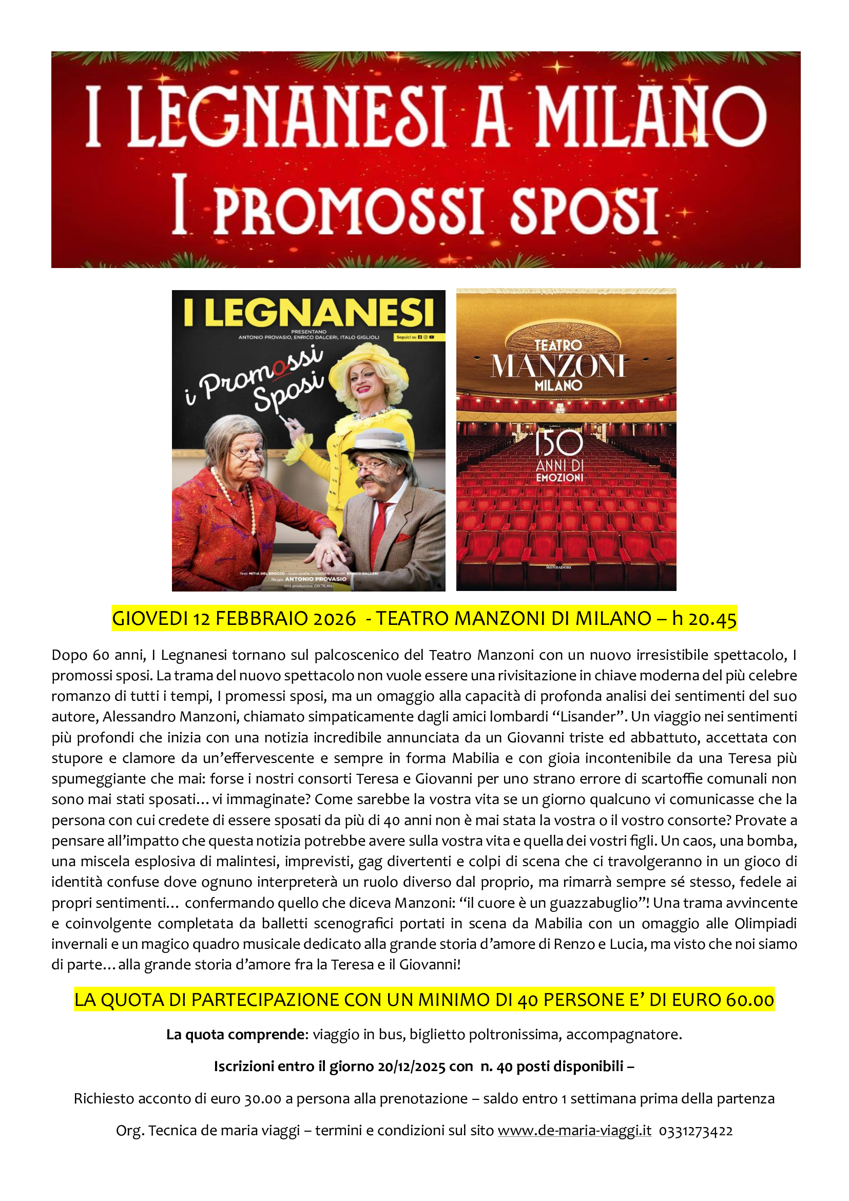 * Giovedi 5 Febbraio 2026: I legnanesi a Milano Teatro Manzoni - biglietto e bus